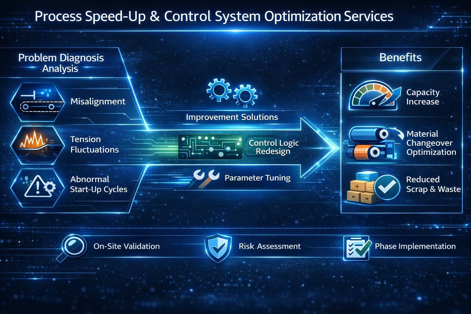 We provide engineering services to enhance process speed and optimize control systems, helping customers increase production capacity while reducing instability and material waste during high-speed operation, material changeovers, and startup phases.